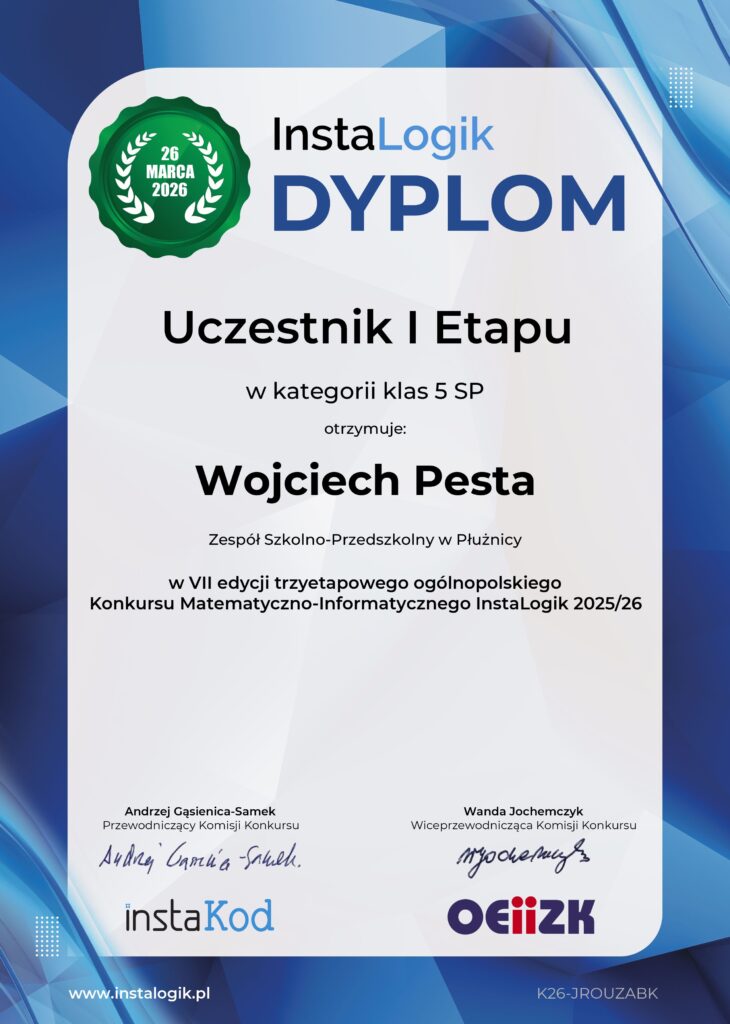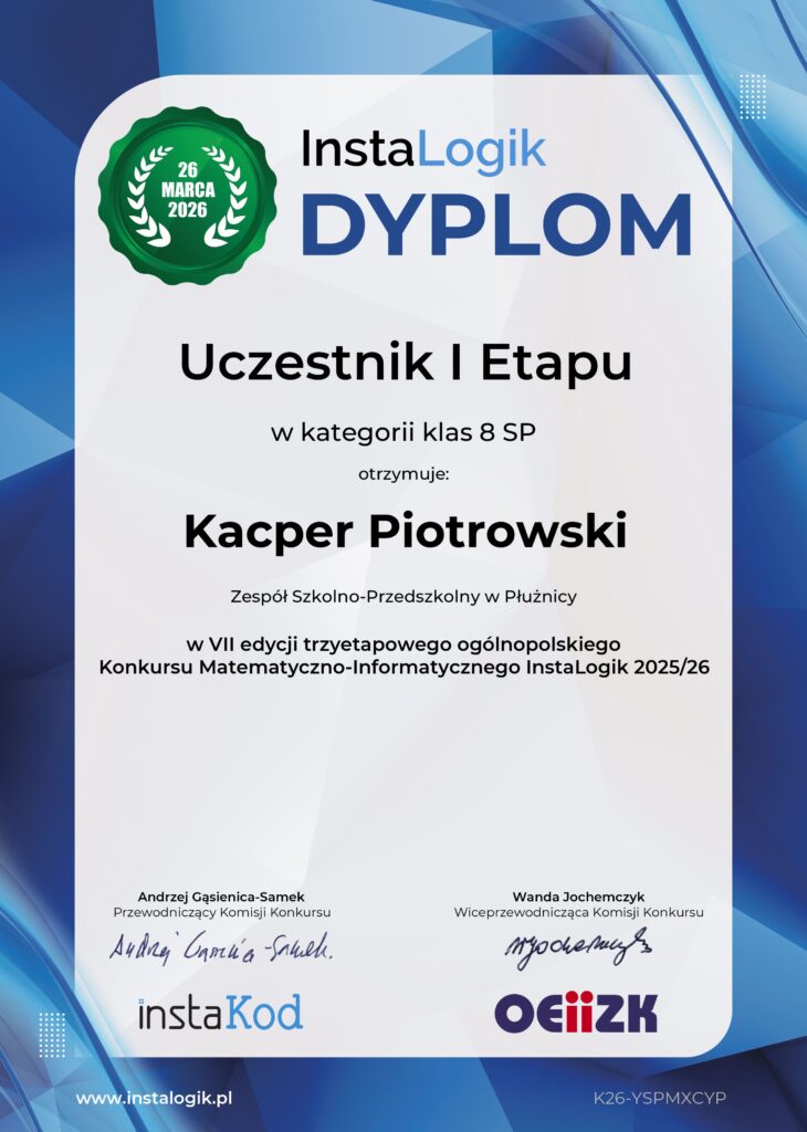 Nasi uczniowie klas 4 – 8 mogli uczestniczyć w matematyczno – informatycznym konkursie ogólnopolskim organizowanym przez InstaLogik. Konkurs miał 3 etapy realizowane on-line. Każdy uczeń otrzymał swoje konto, na którym rozwiązywał samodzielnie zadania z matematyki oraz informatyki. Uczniowie mogli wziąć udział w webinarze na temat programowania.